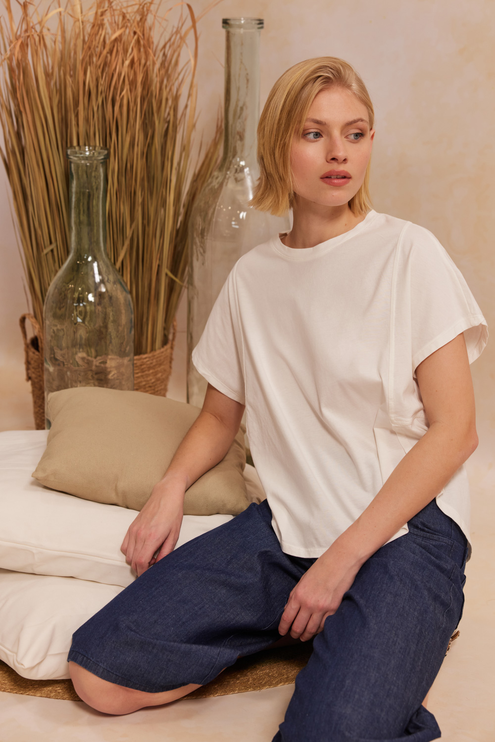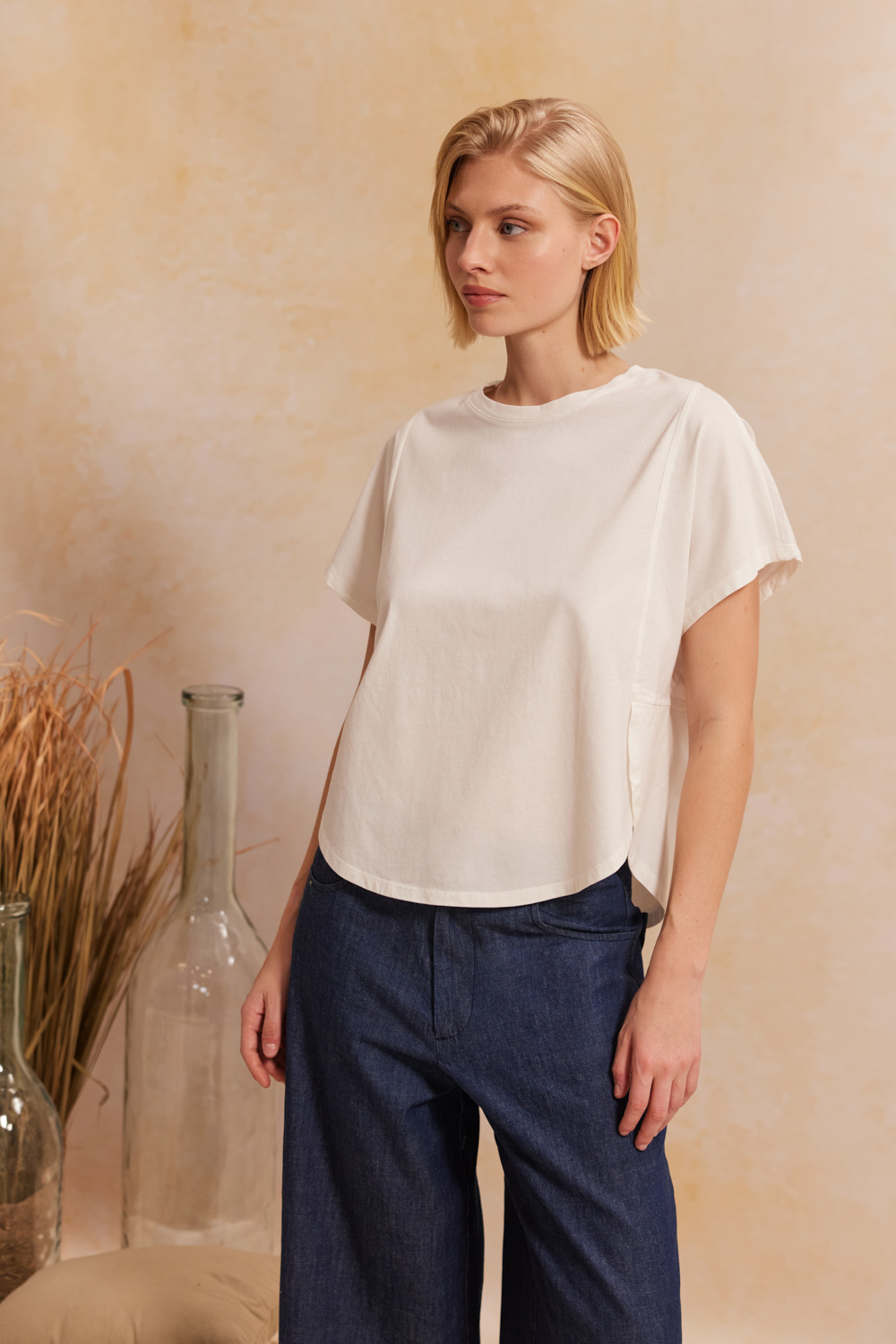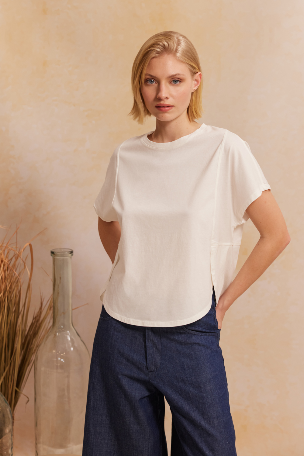 - ΣΧΕΔΙΑΣΤΙΚΟ T-SHIRT ΜΕ ΣΤΡΟΓΓΥΛΗ ΛΑΙΜΟΚΟΨΗ ΚΑΙ ΑΣΥΜΜΕΤΡΟ ΤΕΛΕΙΩΜΑ