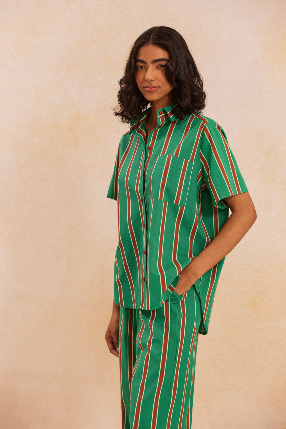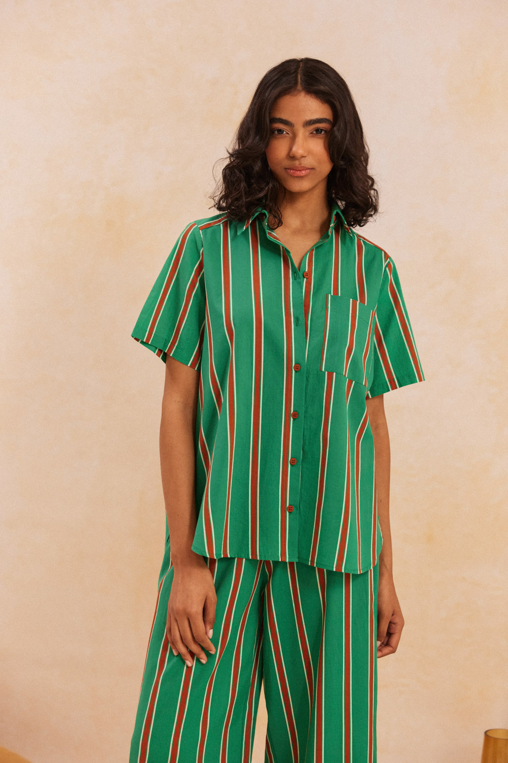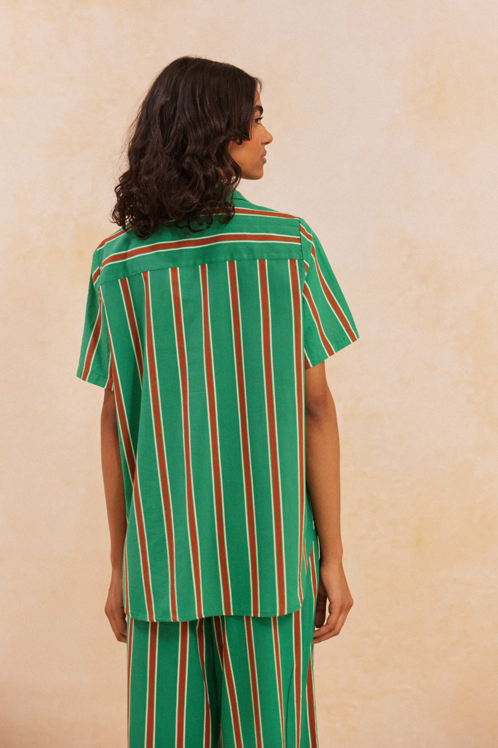 - Πουκάμισο κοντομάνικο με γιακά από βαμβακερό ύφασμα σε φαρδιά κάθετη ρίγα