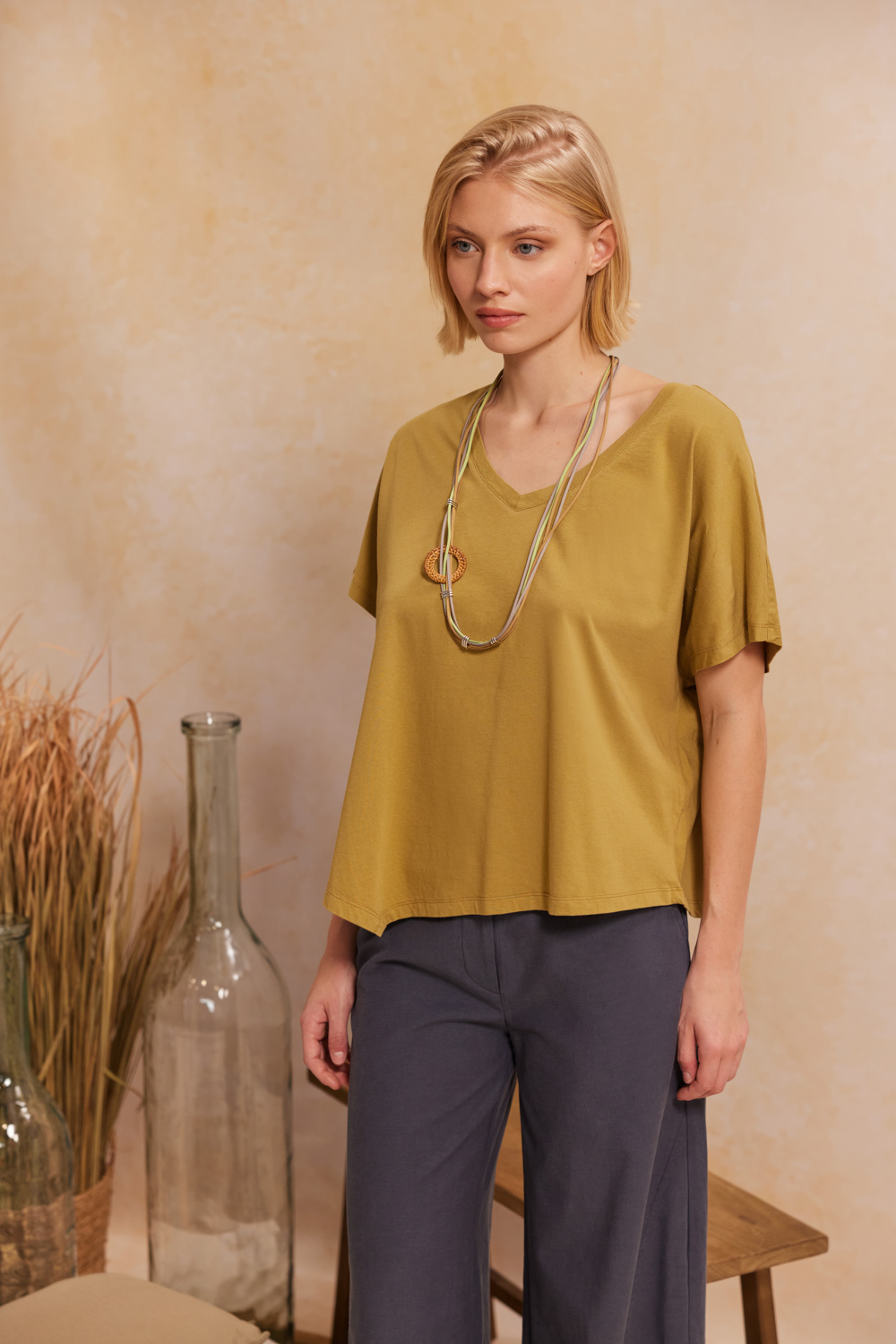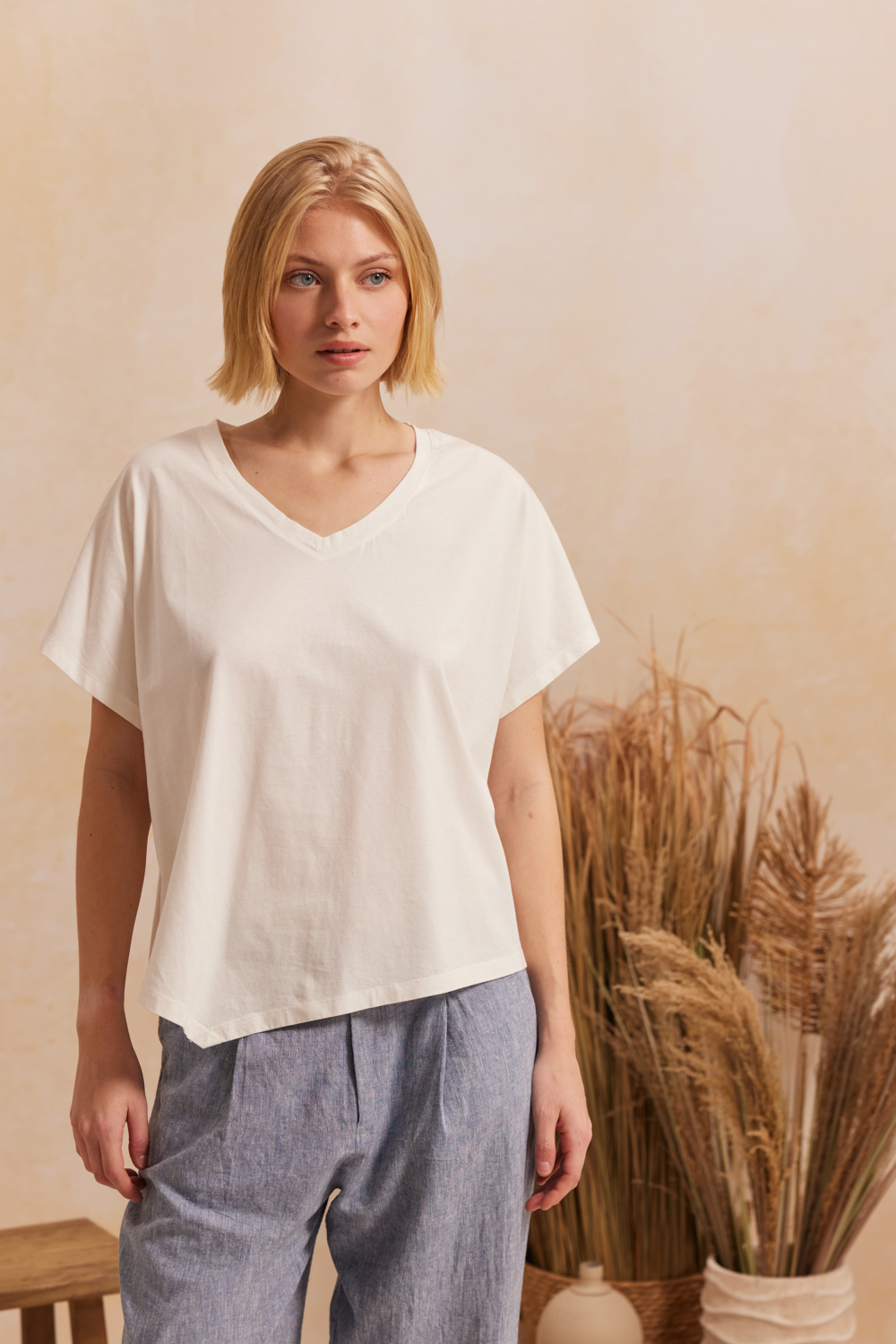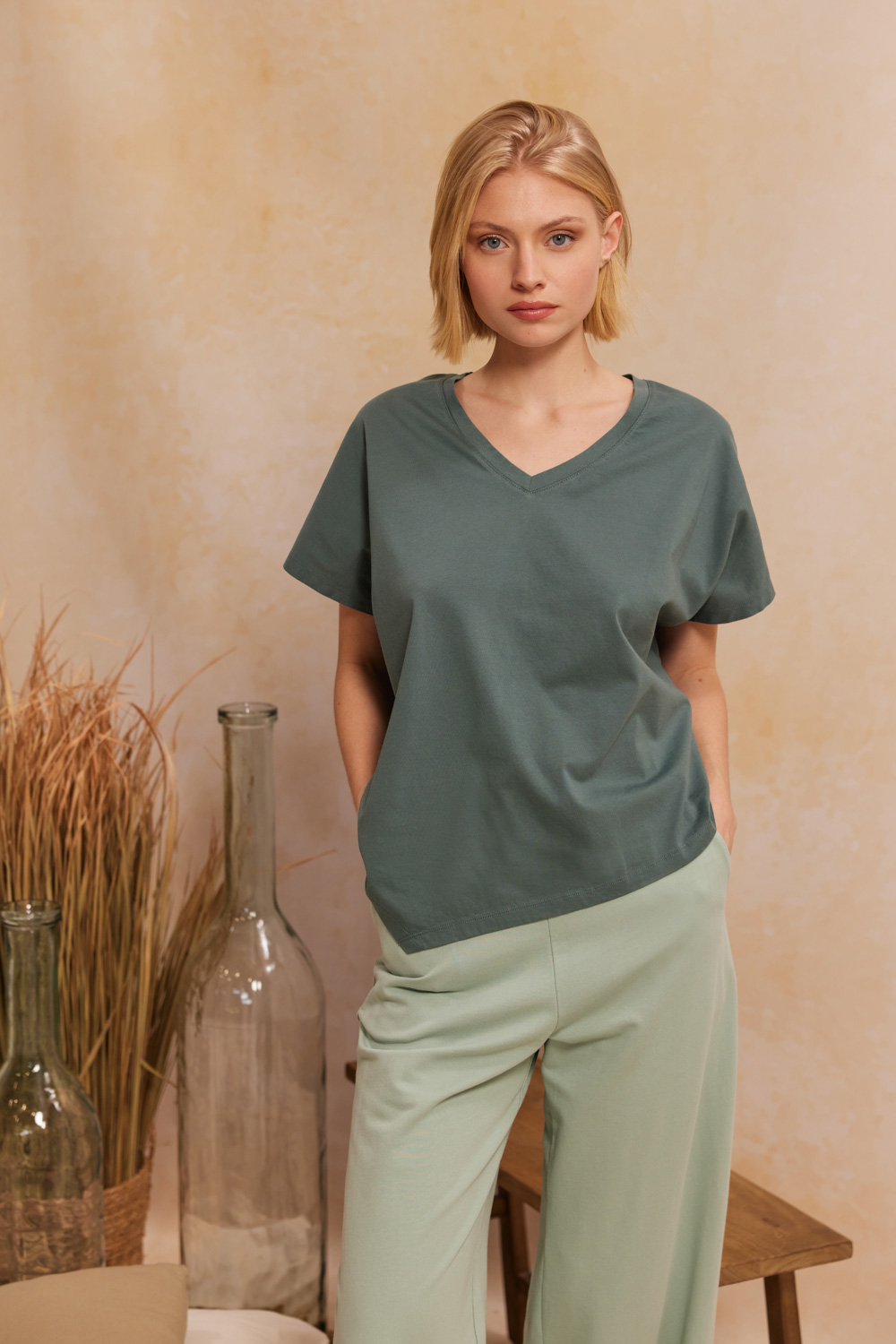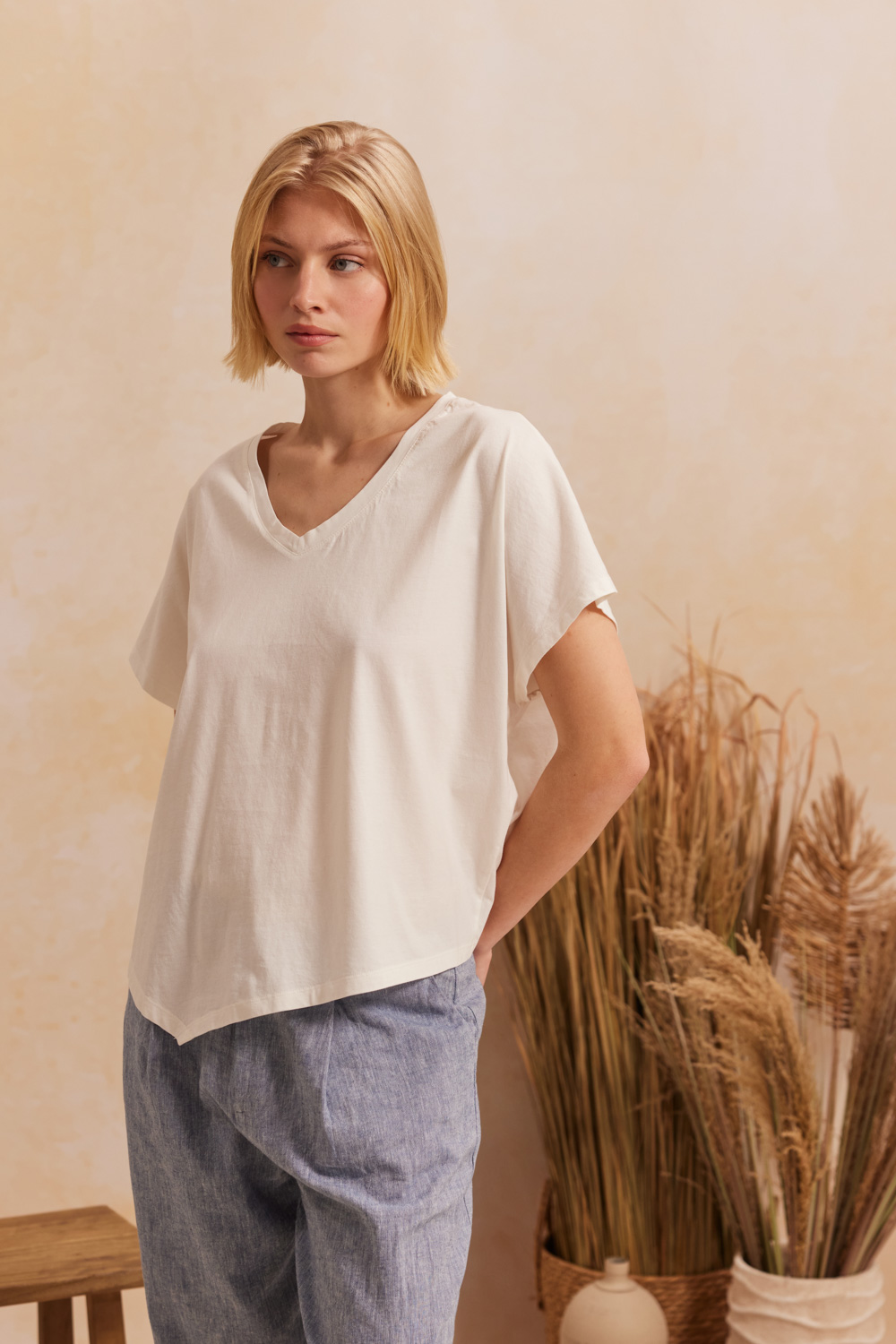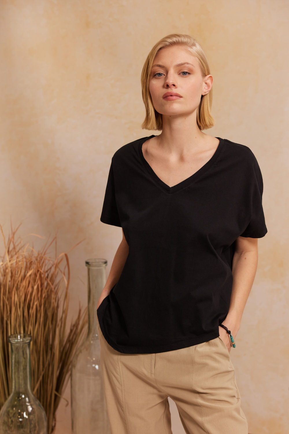 - ΜΠΛΟΥΖΑ ΜΕ ΛΑΙΜΟΚΟΨΗ V ΚΑΙ OVERSIZED ΓΡΑΜΜΗ ΓΙΑ ΑΝΕΣΗ ΚΑΙ ΣΤΥΛ